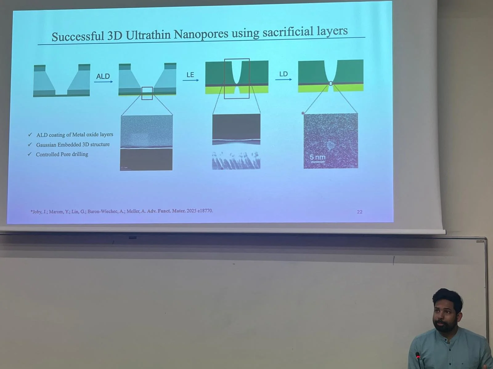 In his seminar, Jostine Joby, Lab PhD student, discussed his innovative work on ultrathin metal-oxide nanopores for single-molecule detection. Using a combination of laser sculpturing in liquid and atomic layer deposition, Jostine’s approach allows rapid, label-free detection of DNA, microRNA, and proteins with exceptional precision.